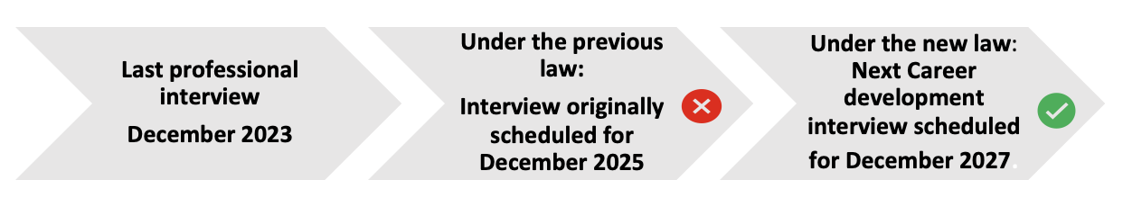 Another change in the law is that career development interviews must follow a different format at two specific points in an employee’s career: