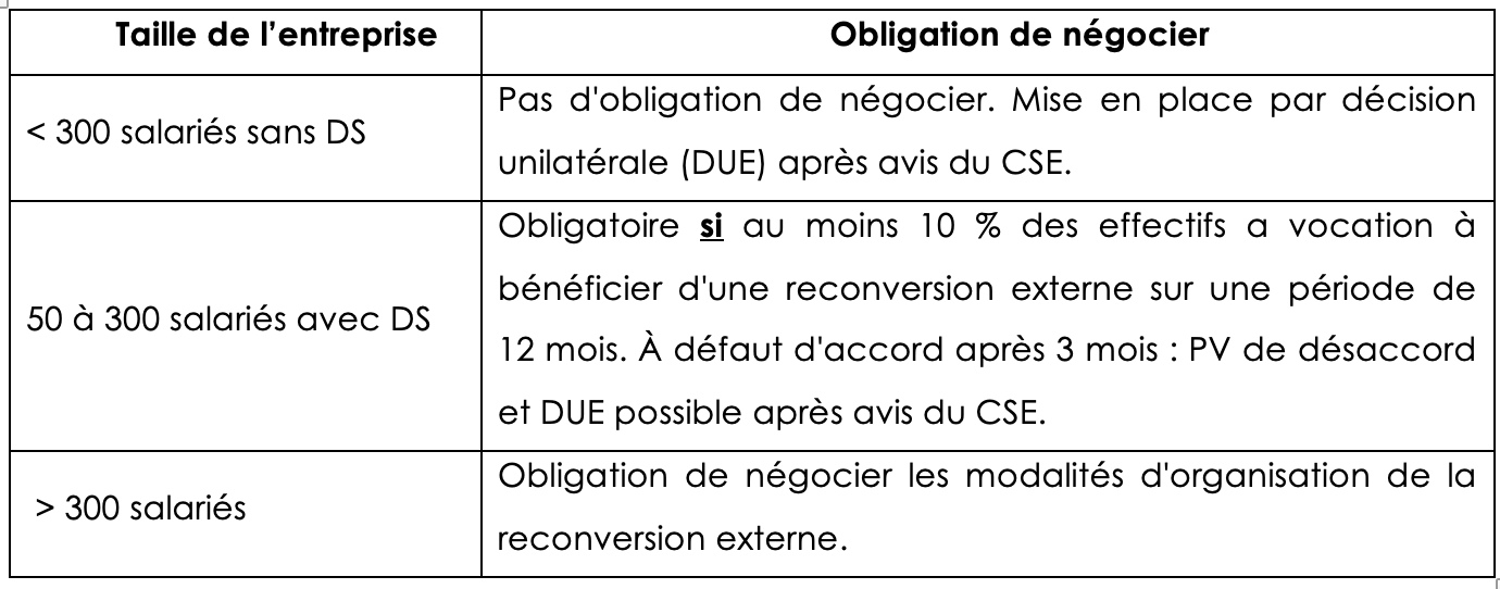 Le cadre fixé par la loi pour la négociation est celui de la GEPP (Gestion des Emplois et des Parcours Professionnels) ou d’une RCC (Rupture Conventionnelle Collective).